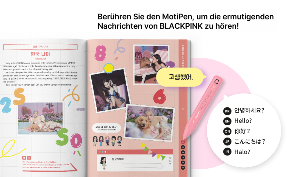 Höre die richtige koreanische Aussprache, Erklärungen in Englisch, Chinesisch, Japanisch und Indonesisch – und motivierende Botschaften direkt von Blackpink.