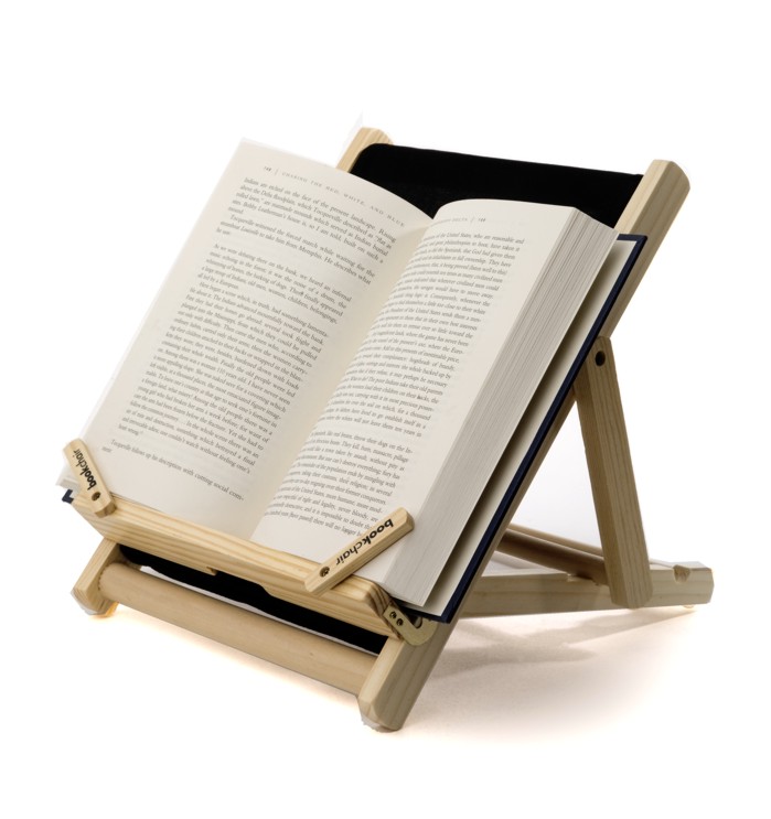 Der Bookchair ist ein ergonomischer Leseständer für Bücher, E-Reader und Tablet-PCs. Ausziehbare Seitenhalter (bis 5 cm) halten auch dicke Bücher offen, so dass die Hände beim Lesen frei bleiben. Der Bookchair lässt sich auf drei Lesewinkel einstellen, praktische Gummistopper sorgen für rutschfesten Halt und zusammengeklappt passt der Bookchair in jede Tasche. Der ideale Buchständer für Studium, Freizeit und Reise.