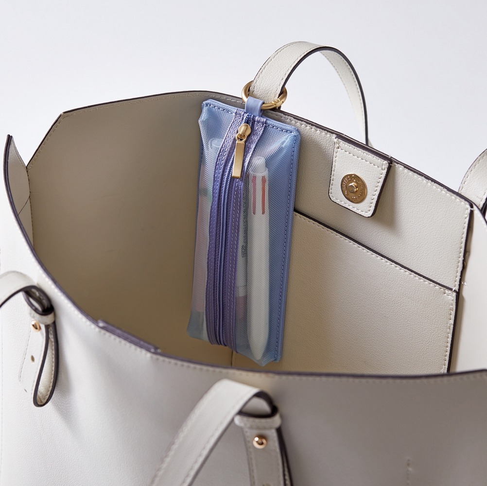 Die Oberseite besteht aus halbtransparentem Mesh und erlaubt einen Blick auf den Inhalt, während die flache Unterseite aus weichem Kunstleder ein bequemes Tragen zusammen mit Unterlagen erlaubt.