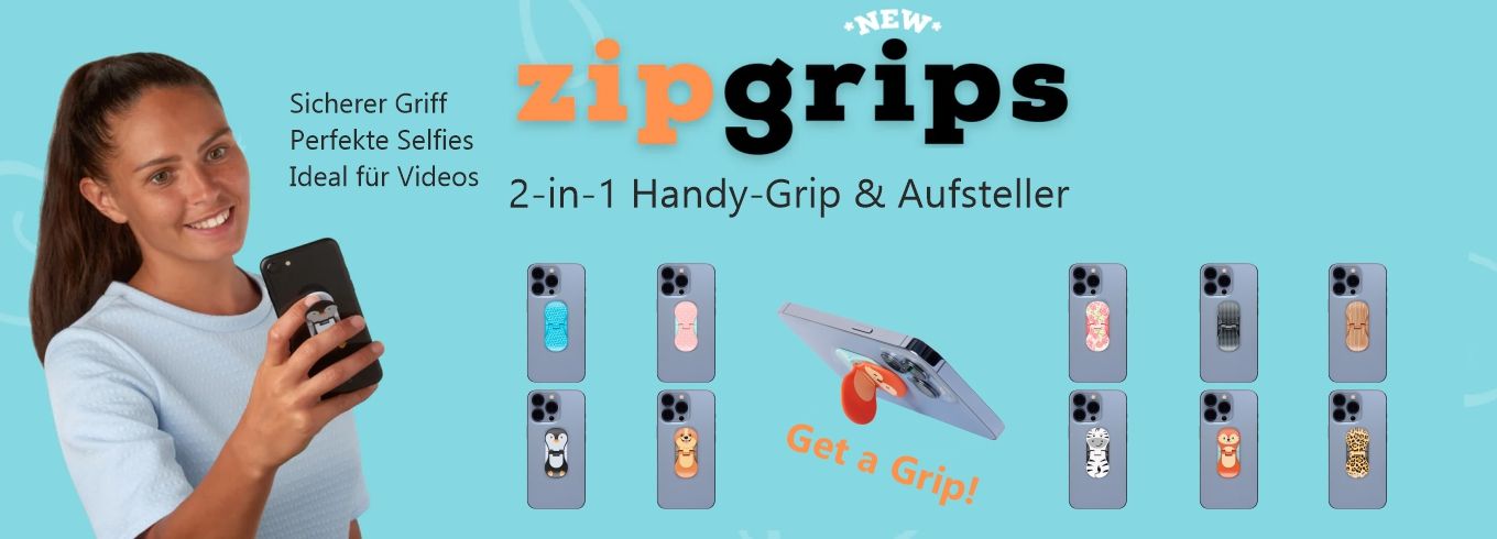 Mit zipgrips hältst du dein Handy immer sicher in der Hand und kannst bequem mit einer Hand tippen, Fotos aufnehmen und Videos ansehen. Außerdem kannst du dein Handy einfach so aufstellen, dass du entspannt Videos schauen oder endlose Videochats machen kannst.