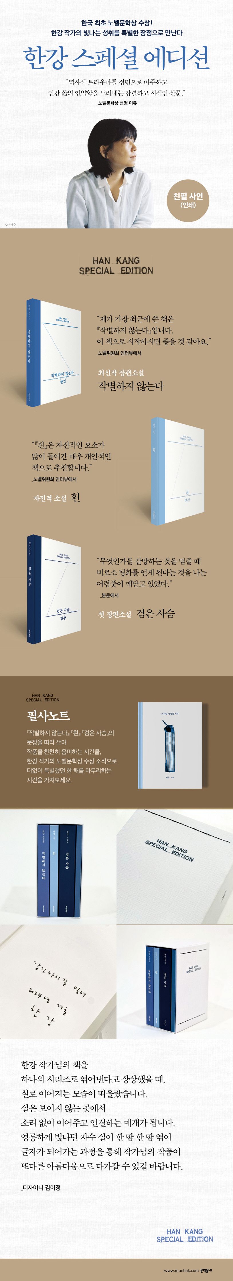 소설 3종에 한정판 필사 노트를 더하였다. 『작별하지 않는다』 『흰』 『검은 사슴』의 문장을 따라 쓰며 작품을 찬찬히 음미하는 시간을, 한강 작가의 노벨문학상 수상 소식으로 더없이 특별했던 한 해를 마무리하는 시간을 독자들과 나누고 싶다.