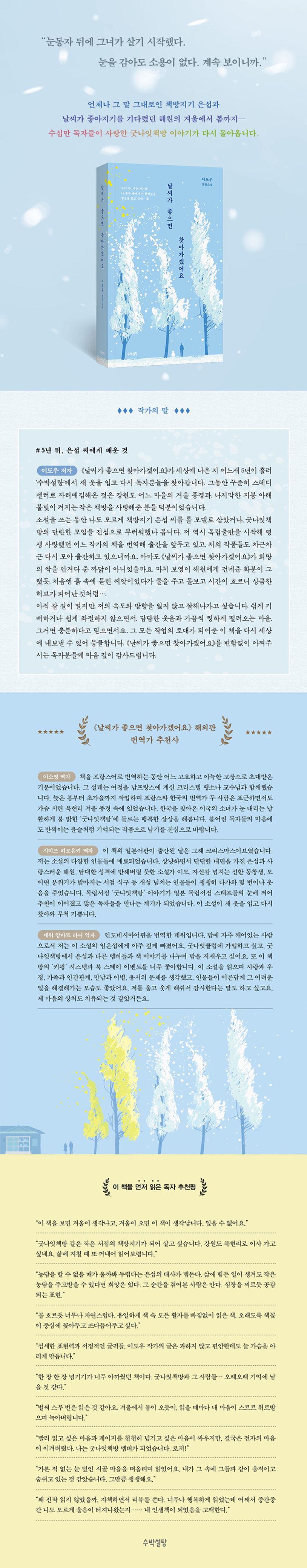 굿나잇책방에 모이는 다양한 인물들은 나이와 세대를 초월해, 그들이 읽는 책과 함께하는 겨울 풍경, 크고 작은 사건 속에 서로를 위로하며 변화시키는데… 오랫동안 베일 속에 숨겨졌던 비밀이 모습을 드러내면서, 한겨울 평화롭고 다정했던 눈송이는 거칠게 몰아치는 눈보라로 변한다.