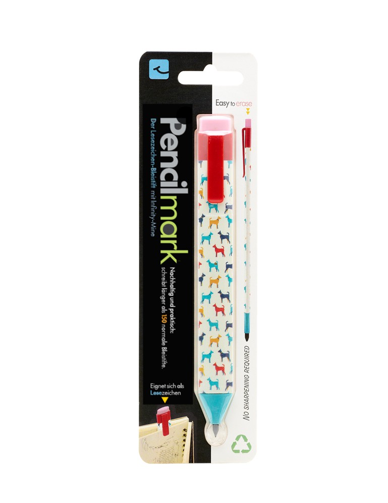 Und das Beste ist: Der Pencilmark ist mit einer Infinity-Mine ausgestattet, das heißt, er ist schreibt so lange wie 100 normale Bleistifte und braucht nicht angespitzt zu werden. Und natürlich darf ein Radiergummi nicht fehlen.
