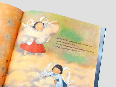 Zwei kleine Feen weben fleißig weiße Schäfchenwolken und große Regenwolken, schwarz wie die Nacht. Doch sie finden es langweilig, still zu sitzen und aufzupassen, dass sich die langen Röcke ihrer Flügelkleider bei der Arbeit nicht zwischen den Beinen verheddern. Da beschließen sie, die unbequemen Kleider abzuwerfen und sich aufzumachen, die Welt unter den Wolken zu erkunden. Ganz so einfach ist es aber nicht. Die Ausreißerinnen müssen einige Hürden überwinden. Als sie herausfinden, wie sie aufregende Gewitter erzeugen können, ist es mit der Langeweile ein für alle Mal vorbei. Sind Blitz und Donner etwas, was man fürchten muss? Oder sind sie nicht vielleicht eine weitere Möglichkeit, Regentage lustig zu verbringen?