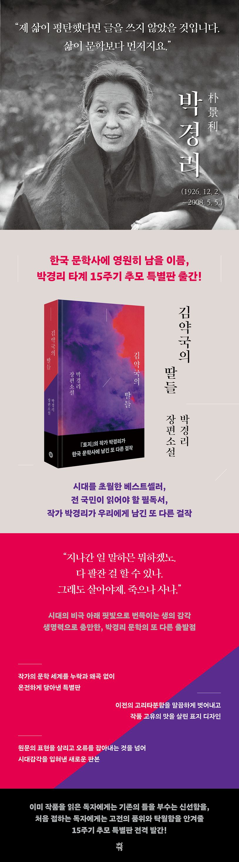 원전을 충실하게 살린 편집과 고전에 대한 선입견을 완벽하게 깨부수어줄 디자인으로 새 시대의 새 독자를 만날 준비를 마친 이번 기획의 포문은 대표작이자 박경리 장편소설의 최고봉이라 일컫는 『김약국의 딸들』이 연다. 한 집안의 몰락과 비극적 운명 앞에 몸부림치는 군상을 치밀하고 선연하게 그려낸 작품이다.