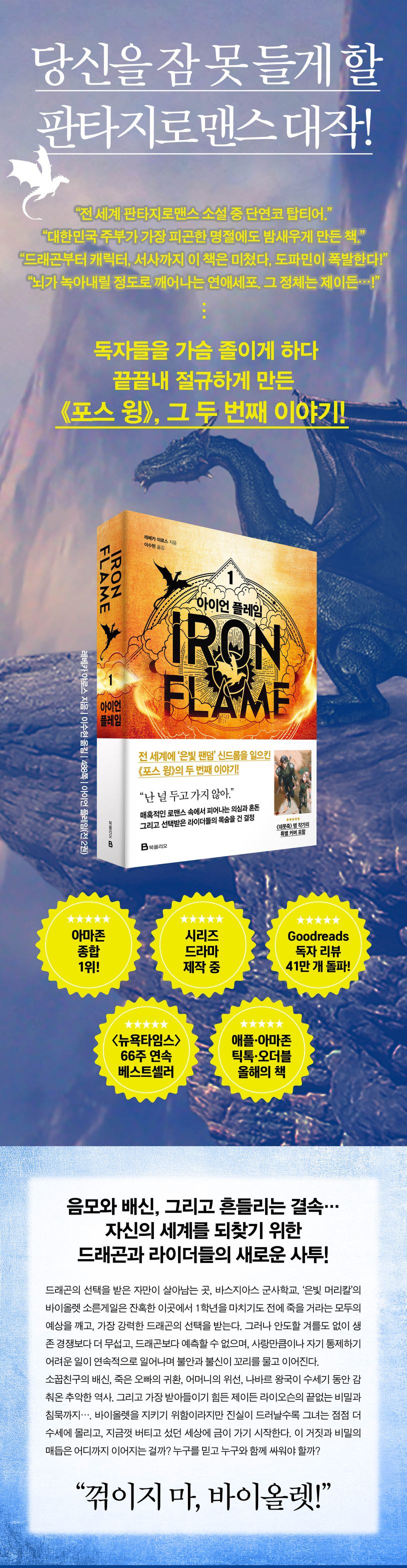 예약 판매만으로 아마존 종합 베스트셀러 1위에 오르며 독자들의 열렬한 지지와 찬사를 입증한 《아이언 플레임》은, 매력적인 드래곤들과 라이더들이 켜켜이 쌓아 올리는 연대와 예측 불가한 로맨스, 거듭되는 반전을 바탕으로 속도감 있는 전개와 재미를 선보인다. 바스지아스 군사학교에서 벌어지는 사건을 주로 다룬 《포스 윙》과 달리 《아이언 플레임》은 군사학교 밖 새로운 환경과 위기에 부딪힌 인물들의 감정과 격변을 한층 더 섬세하게 그려내며 독자들을 더욱더 매료시킨다.